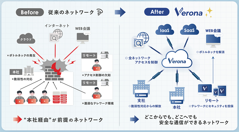 Veronaは、ゼロトラストセキュリティを実現するフルマネージドSASEです。​働く場所を選ばない、統一された次世代ネットワークセキュリティを実現します。​さらに、ソニーならではのクラウドサービスを掛け合わせることで、AWSなどにも拡張可能なハイブリッドサービスです。​