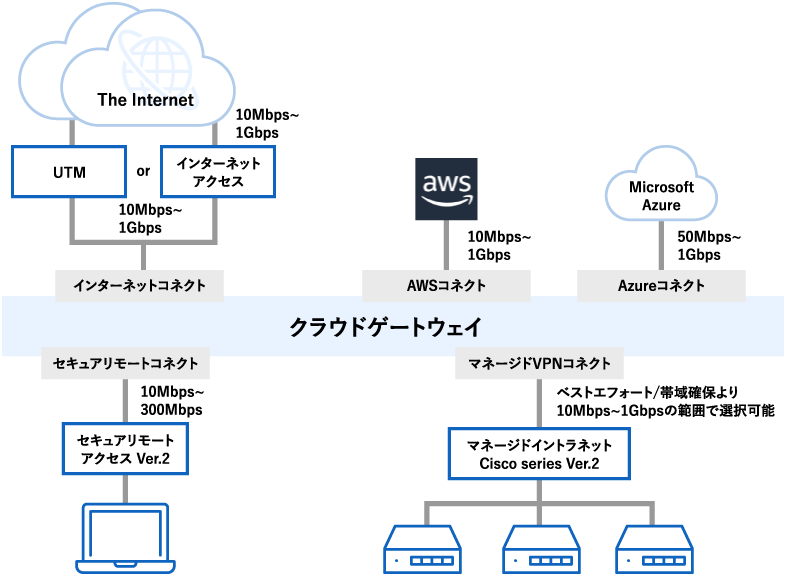 マネージドVPNコネクトを介し、各種クラウドサービスに接続したり、UTMやインターネットアクセスを経由してインターネットに出ることが出来ます。その際、マネージドVPNコネクトの帯域やクラウドに接続する為の帯域、インターネット接続する為の帯域を選択することができます。※Ver.2より